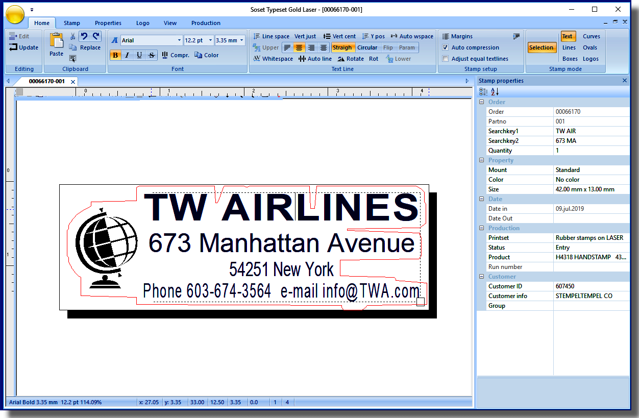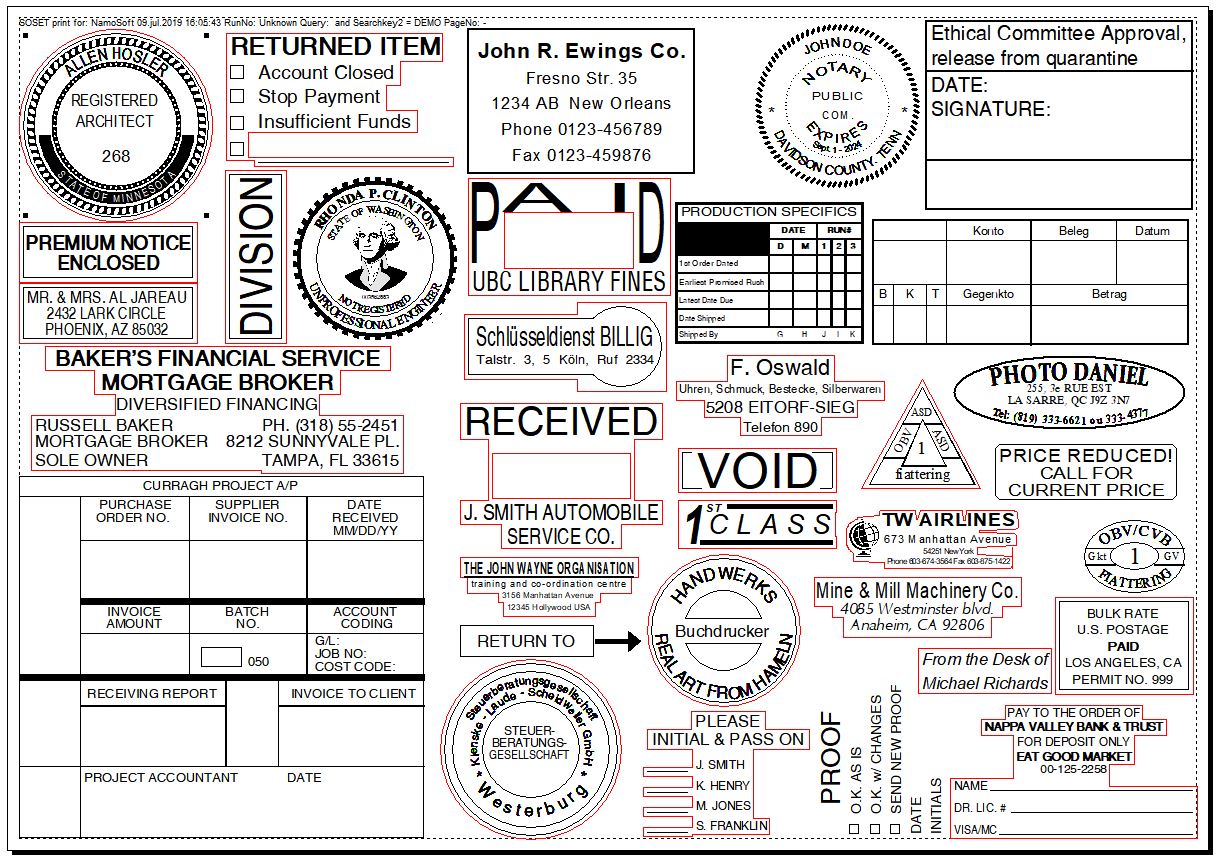 • After proofreading, e.g. all pre-inked stamps per color, all rubber stamps, embossing seals come together on same layout for immediate production.